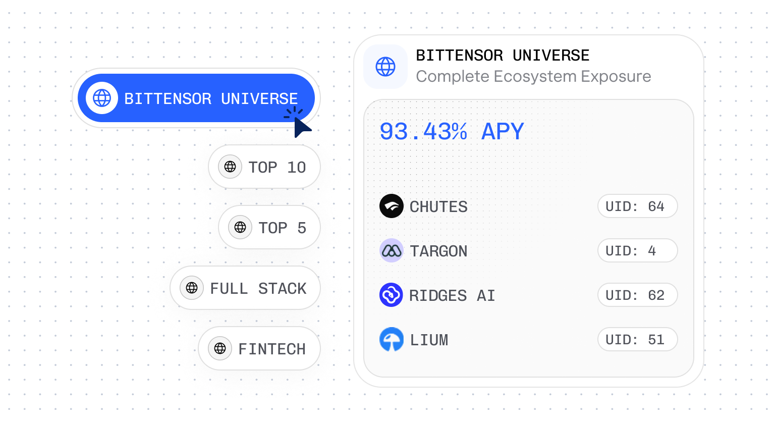 We turn the noise into signal. Our platform handles the deep research, automated strategy, and professional management across the Bittensor ecosystem. You keep complete custody. We focus on one thing: maximizing your position in the future of AI.
